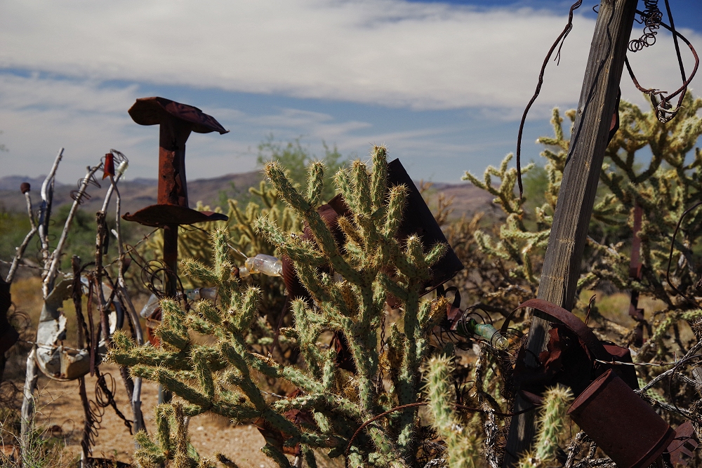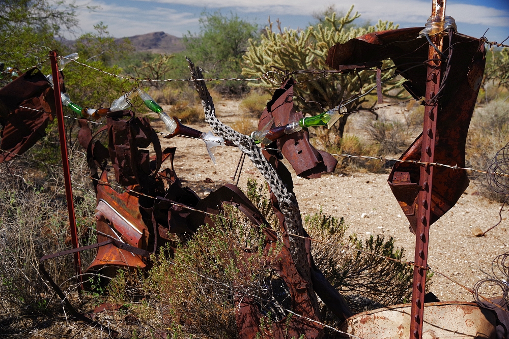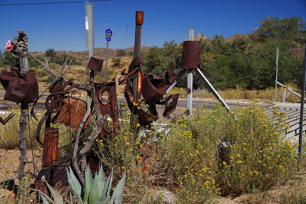 |  Wild metal doo-dads adorn a fence at the entrance to town! |
